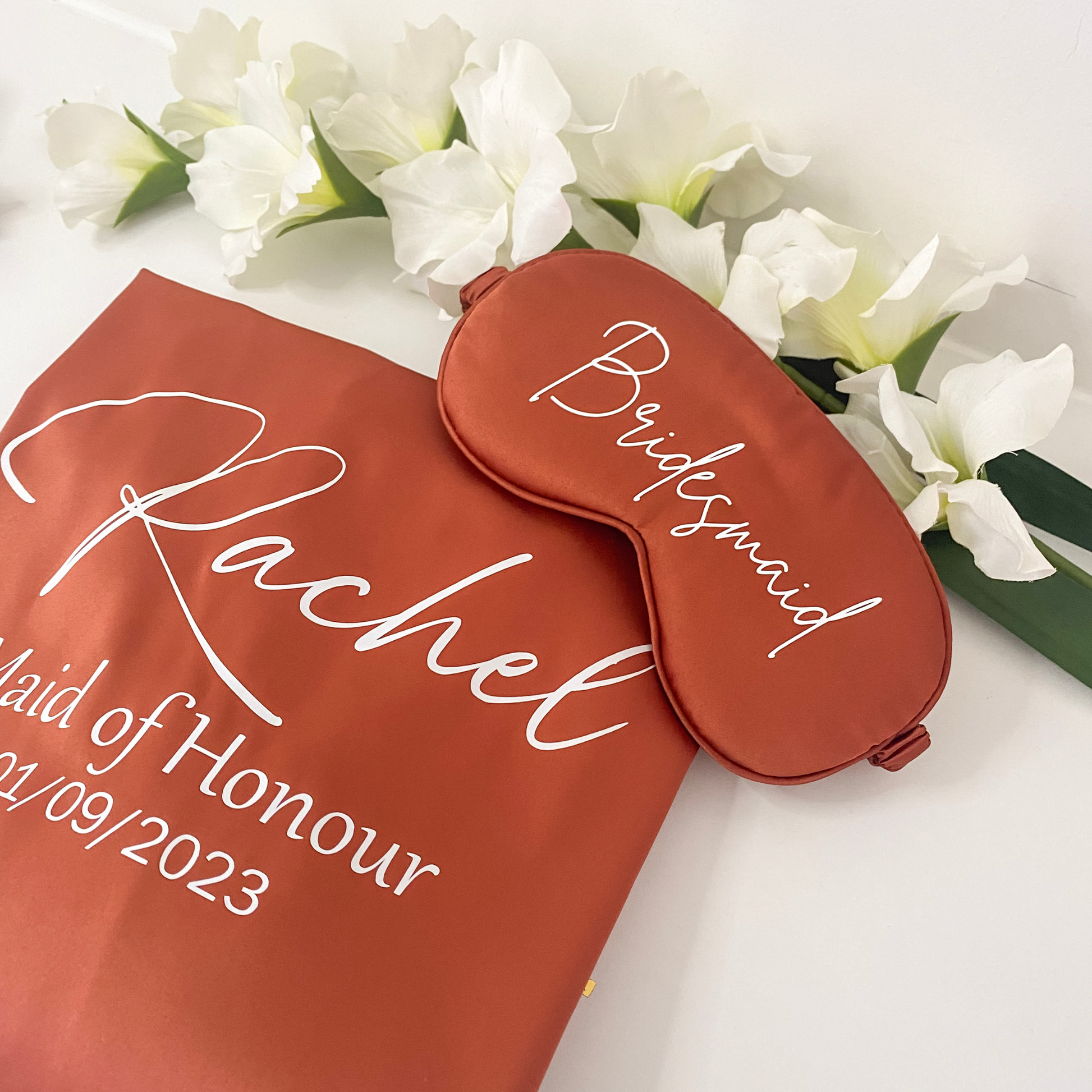 Make the wedding morning extra special with our personalised bridal gift set, including a soft satin robe, matching eye mask and scrunchie. Perfect for the bride, bridesmaids, flower girls or as a thoughtful hen party gift, this set is both practical and a lasting keepsake.