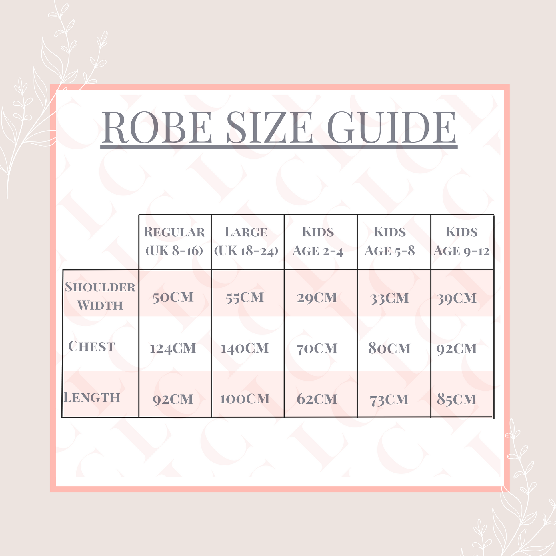 Robes are available in standard and large adult sizes, as well as children’s sizes (ages 2–12). Personalise with your preferred font colour to create a unique look for your bridal party.